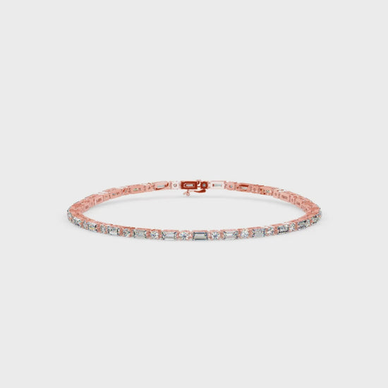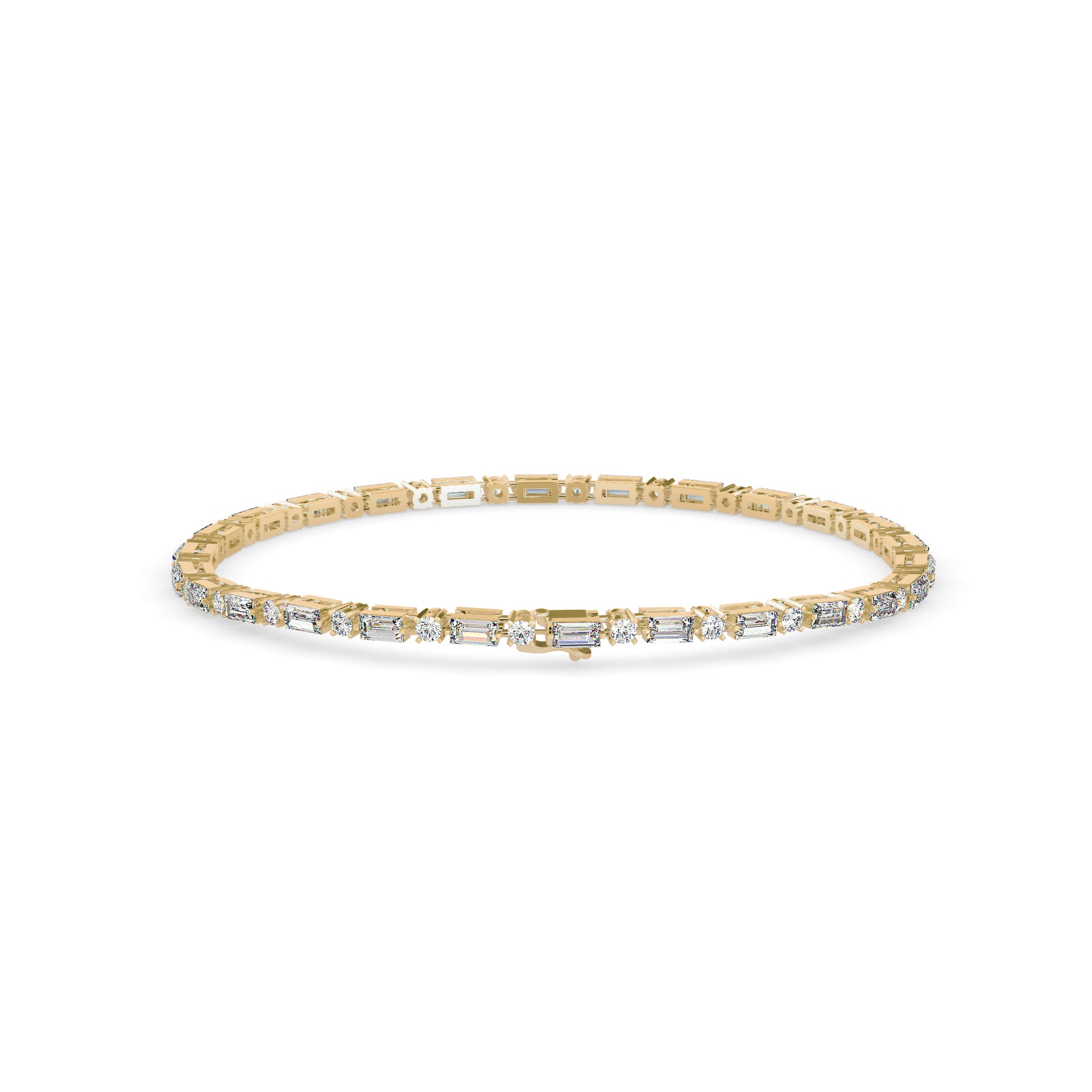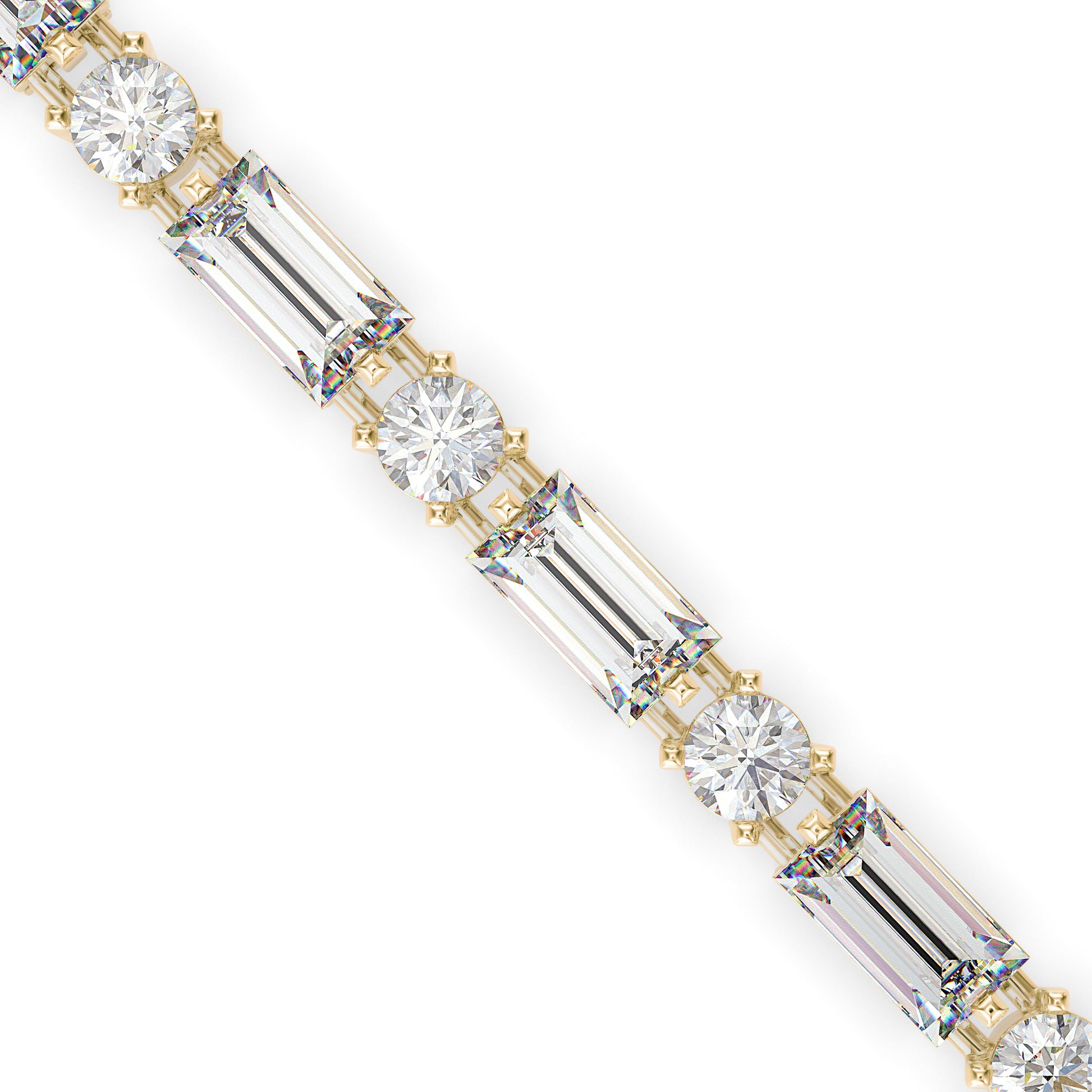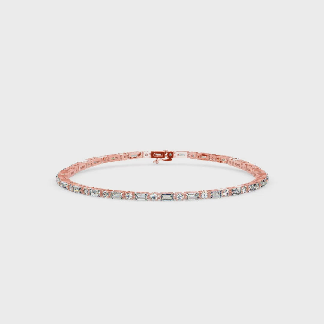 A modern twist on the classic tennis bracelet, this design features alternating round and baguette lab-grown diamonds for dynamic sparkle and refined elegance. Expertly crafted in 14K or 18K Rose, White, or Yellow Gold, it transitions effortlessly from everyday chic to evening glamour. Finished with a secure box clasp and safety latch for lasting comfort.