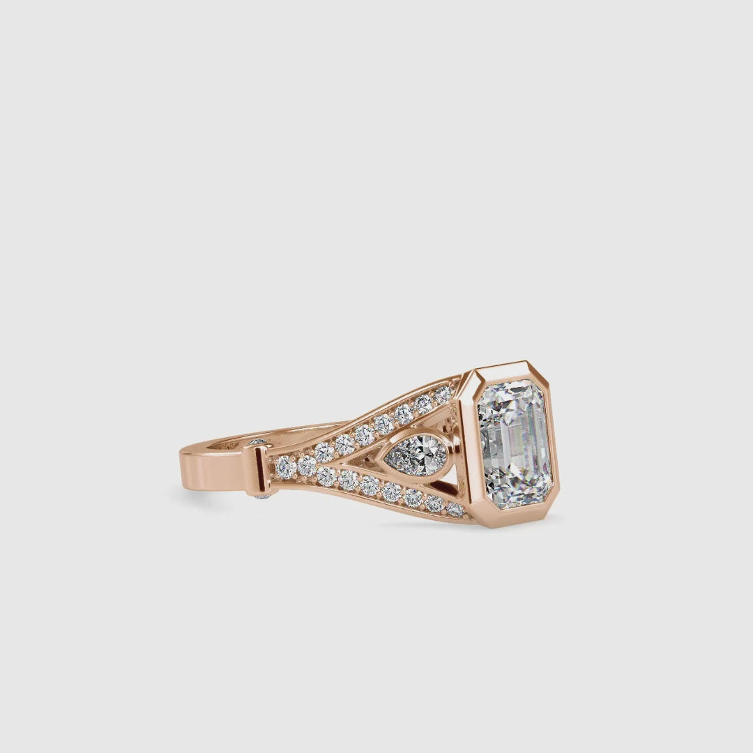 Elegant and refined, this design features a 1.50 ct emerald-cut lab-grown diamond in a sleek bezel setting, flanked by pear-shaped accents and pavé-set diamonds for added brilliance. An openwork gallery enhances light flow, creating a striking play of sparkle from every angle. Crafted in solid 18K or 14K gold (Rose, White, or Yellow), this ring is a perfect choice for engagements, anniversaries, or milestone celebrations.