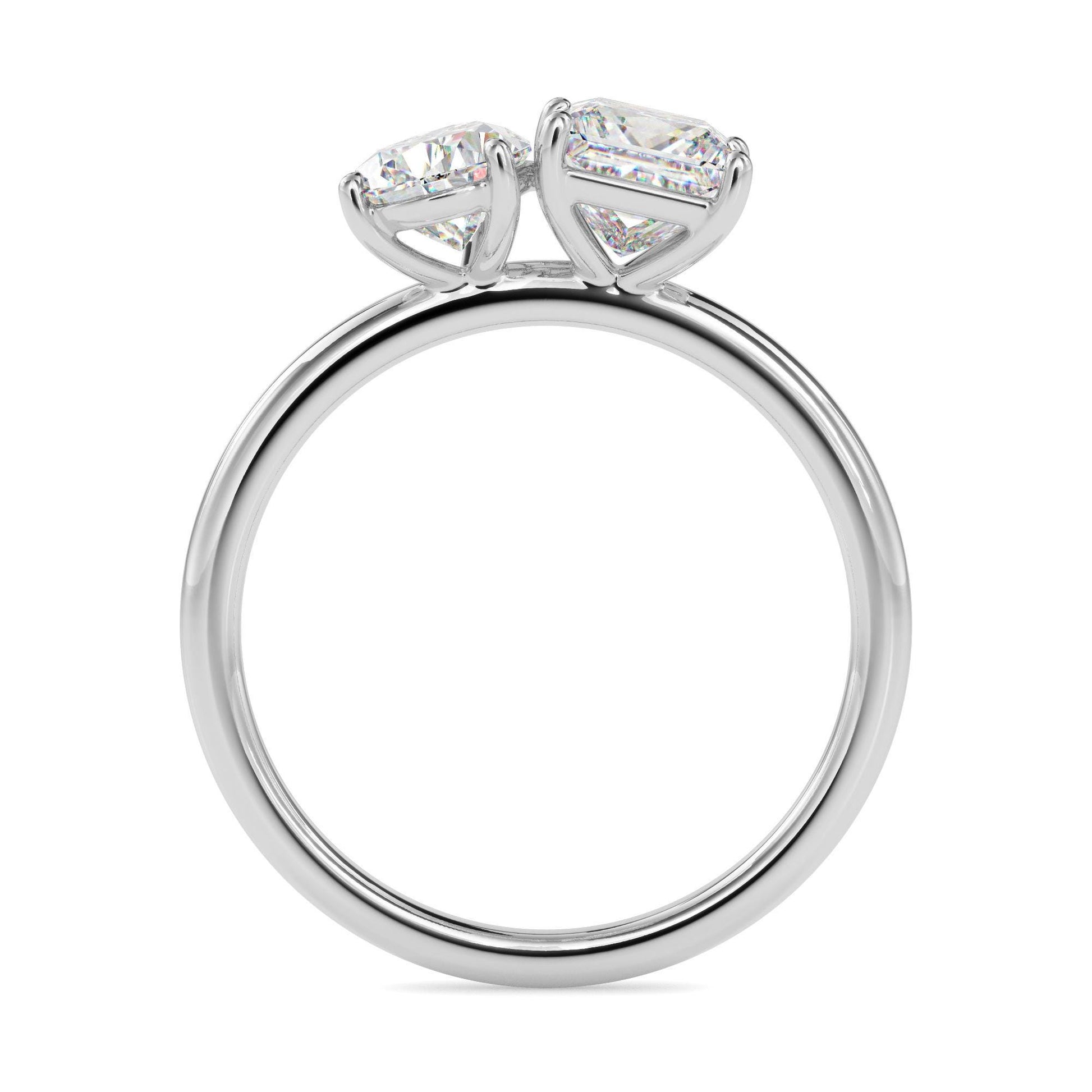 A striking two-stone ring featuring a sharp princess-cut diamond paired with a graceful pear-cut diamond. Bold lines meet soft curves in this open-band design, symbolizing balance, individuality, and unity.