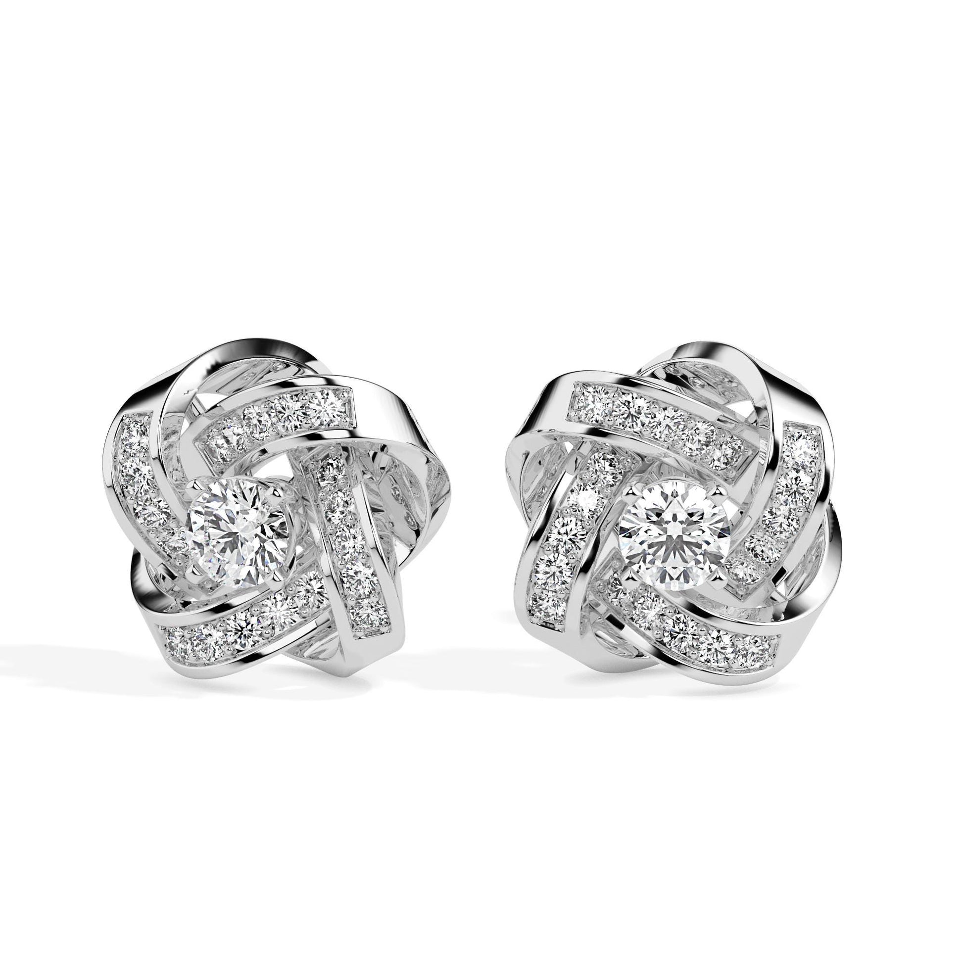 Intricate love knot studs featuring a round brilliant lab-grown diamond at the center, wrapped in interwoven gold ribbons pavé-set with sparkling diamonds. A timeless symbol of unity and everlasting connection.