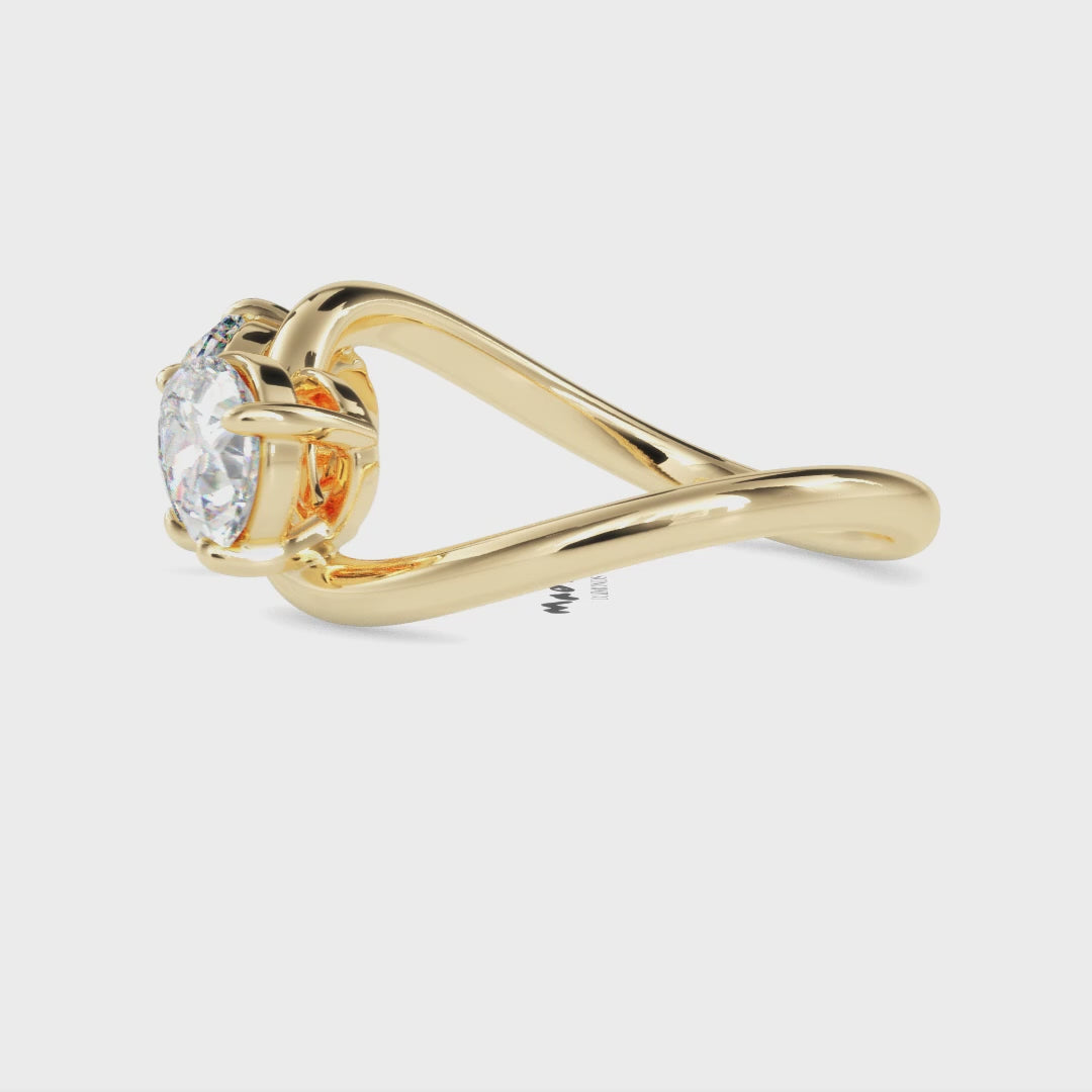 An infinity-inspired two-stone ring featuring a round brilliant diamond and a pear-cut diamond, gracefully entwined in a flowing twist band. A modern symbol of unity and eternal love.